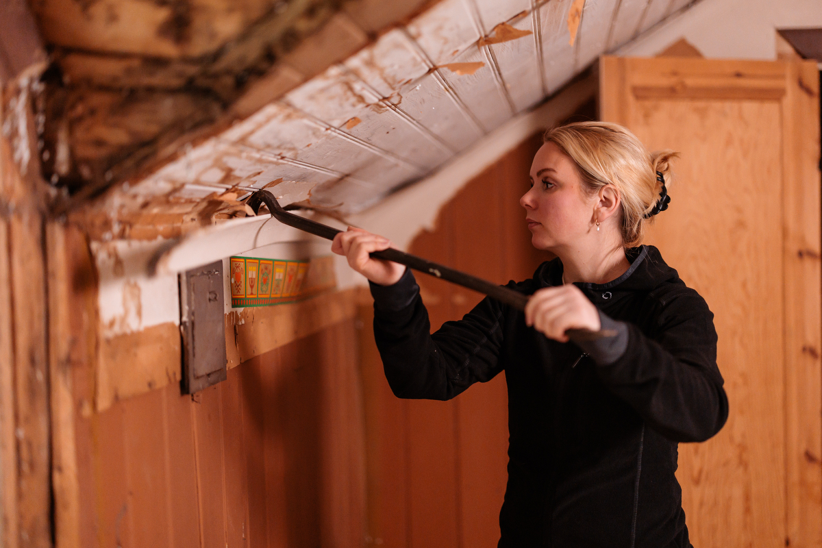 – Det är inte alltid lätt! Jag och min sambo Martin lägger all ledig tid på vårt ödehus. Ofta åker vi dit direkt efter jobbet och renoverar några timmar. Helgerna går också åt till projektet, så familjen får hänga med på bygget.
